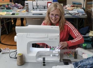 One of our newer quilters, Pat Batten, has experience with several different sewing machines. She offered demonstrations on how to adjust tension on serging machines. She has also generously offered to prepare machined embroidery names to add to our swap blocks!