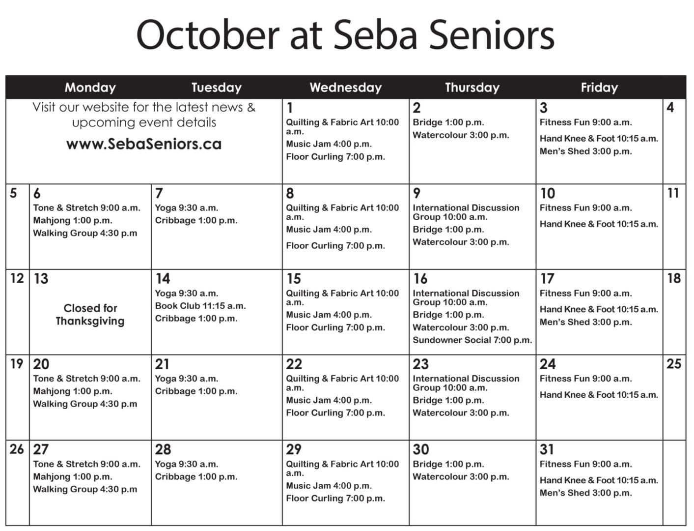 SEBA SENIORS CALENDAR