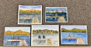 For October, our Watercolour Collective voted on painting adirondack chairs on a dock. The group had a lot of fun learning new techniques to paint this picture. Each Month they will use the last class of the month to paint pictures following a tutorial.